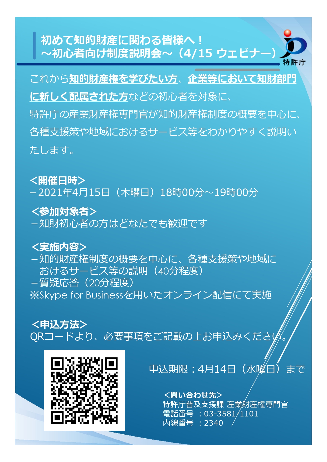 特許庁普及支援課にて初心者向け制度説明会(ウェビナー)開催! (4/15)終了しました。