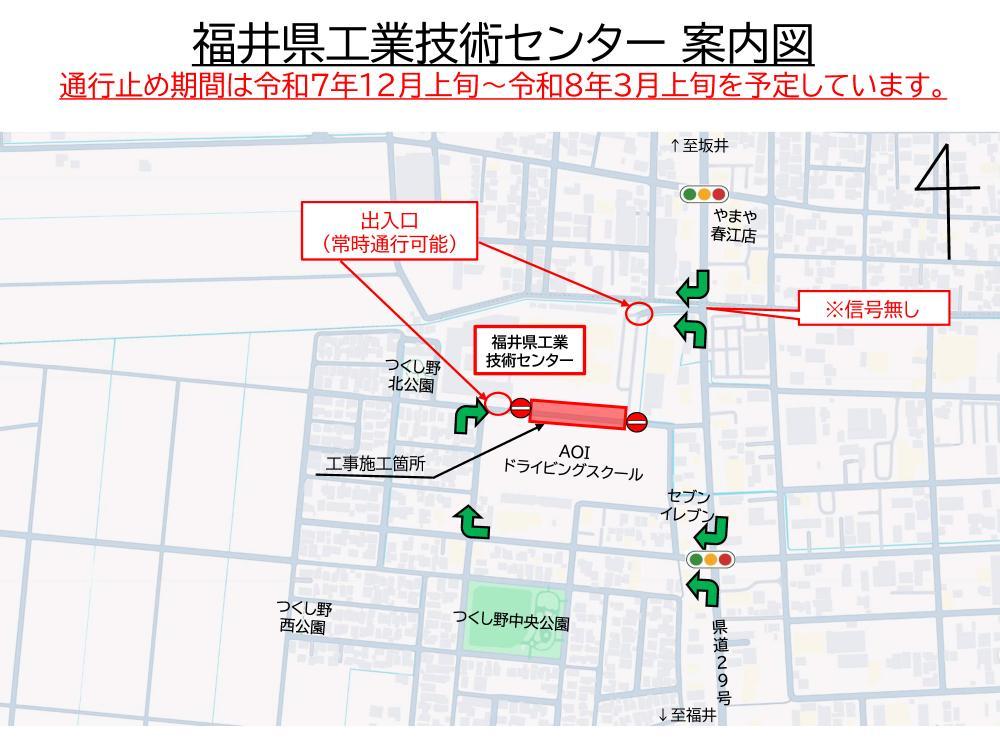 福井工業技術センター 正面入り口付近が、河川工事の為通行止めとなります。