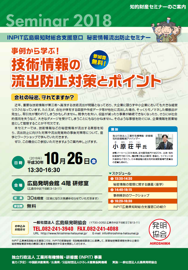 そのような事態を防ぐには、企業情報を営業秘密として管理することが不可欠です。本セミナーでは、技術情報などの秘密情報が流出する実態を知り、流出防止に向けた対策や流出発覚時の事後対策等について、座学とワークショップで学んでいただきます。