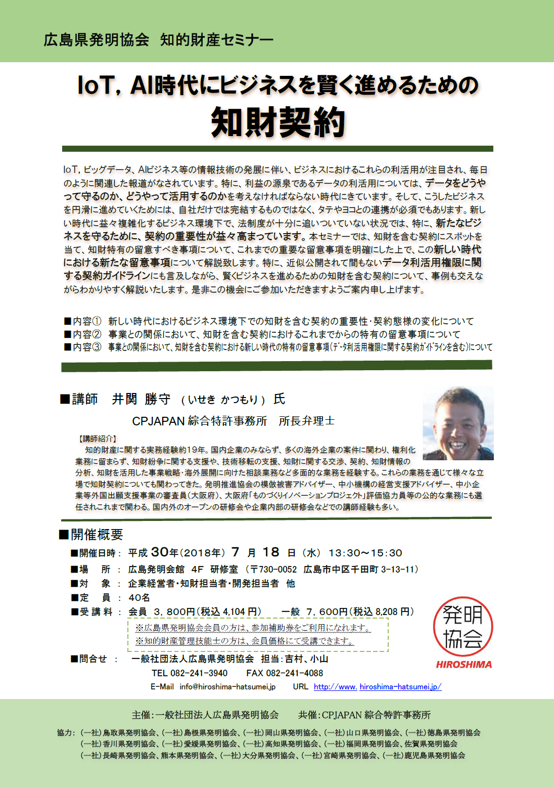 【セミナー】IoT,AI時代にビジネスを賢く進めるための 知財契約(7/18)