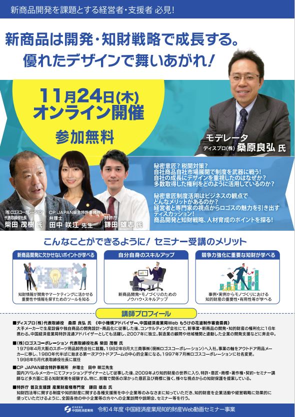 『新商品は開発・知財戦略で成長する。優れたデザインで舞いあがれ!』もうけの花道セミナー(中国経済産業局)11/24開催