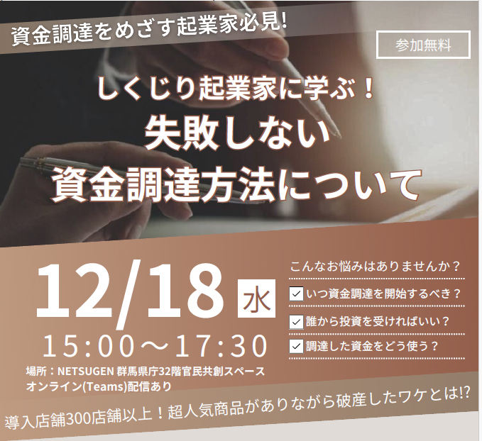 [受付中] 12/18開催 「しくじり起業家に学ぶ!失敗しない資金調達方法について」のご案内