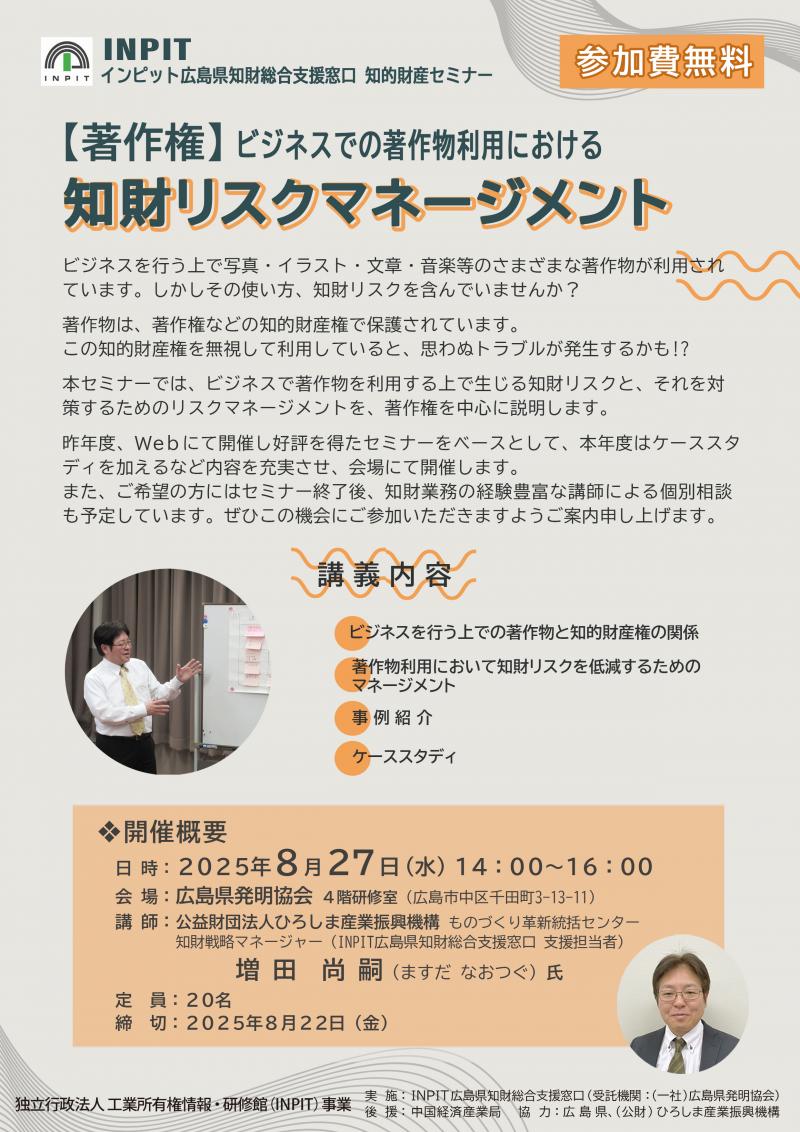 INPIT広島県知財総合支援窓口では今年度、企業の成長に寄与する知的財産を活用したセミナーを6回、開催いたします。