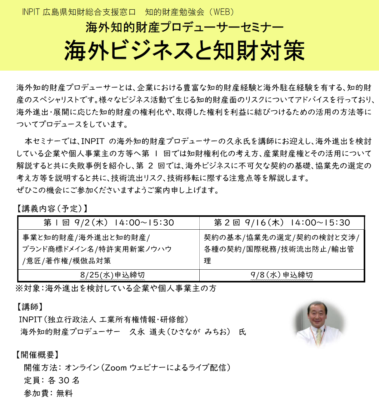 海外知的財産プロデューサーセミナー 海外ビジネスと知財対策(9/2,9/16)