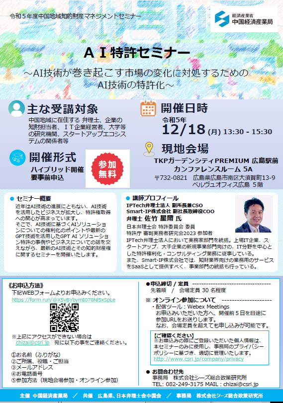 近年はAI 技術の進展にともない、AI 技術を活用したビジネスが拡大し、特許権取得への関心が高まっています。そこで、中国経済産業局主催、広島県、日本弁理士会中国会共催により、AI 技術に基づくAI ソリューションについての権利化のポイントや最新のGPT 技術を活用したGPT AI ソリューション特許の事例やビジネスについての話を交えながら、最新のAI 技術とその知的財産権に関するセミナーが開催されます。