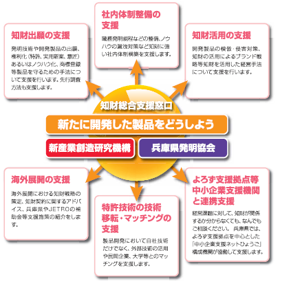 中小企業等が企業経営の中でノウハウも含めた知的財産活動を円滑にできる体制を整備し、アイデア段階から事業展開までの知的財産権に関する悩みや課題をワンストップで解決できる支援を行います