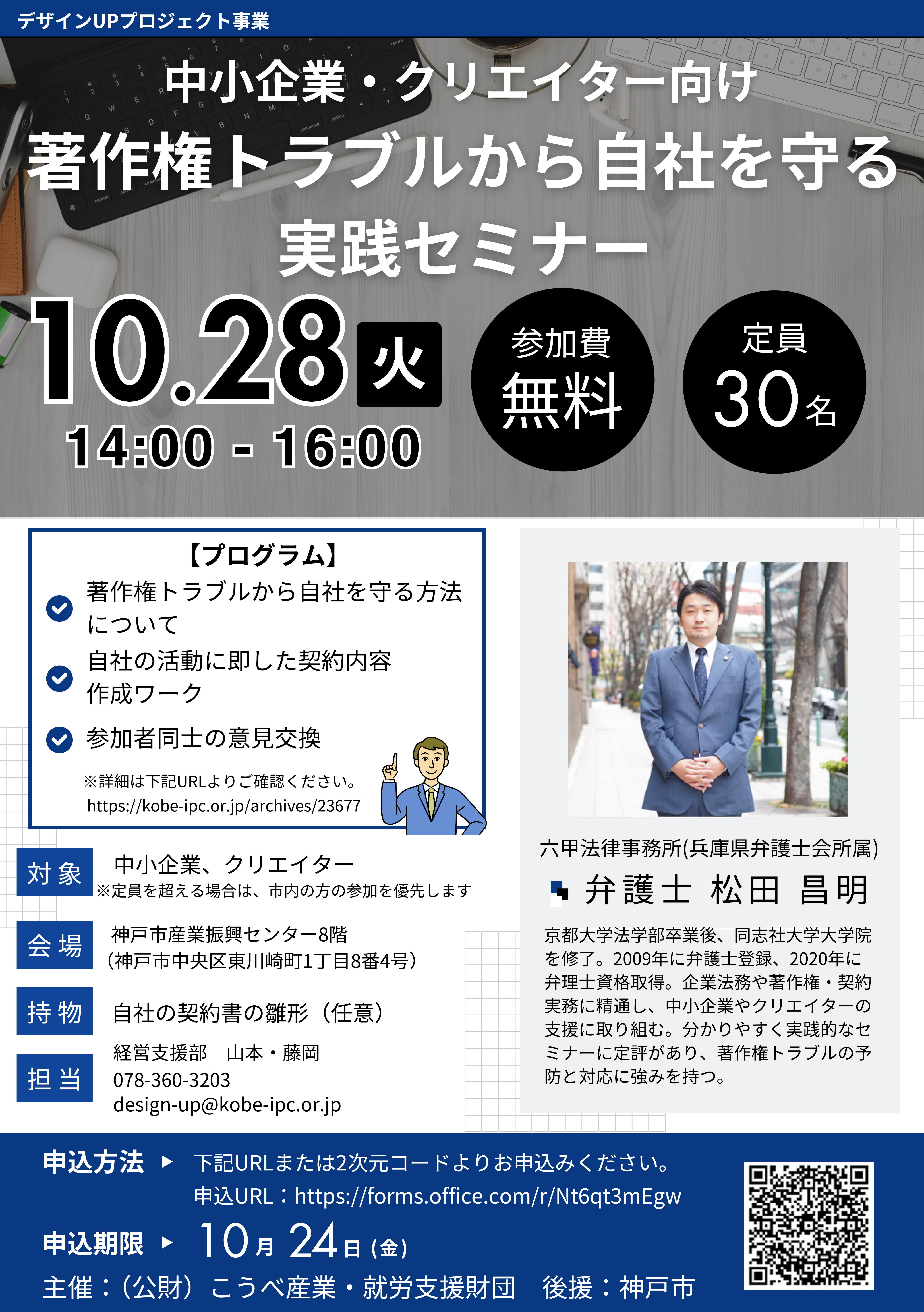 著作権トラブルから自社を守る実践セミナー_参加無料(こうべ産業・就労支援財団)