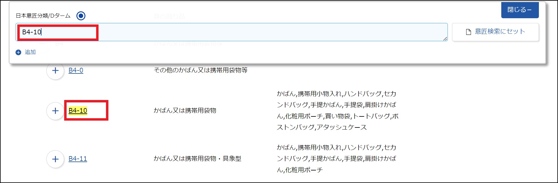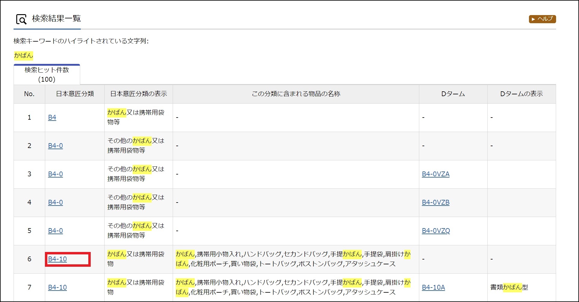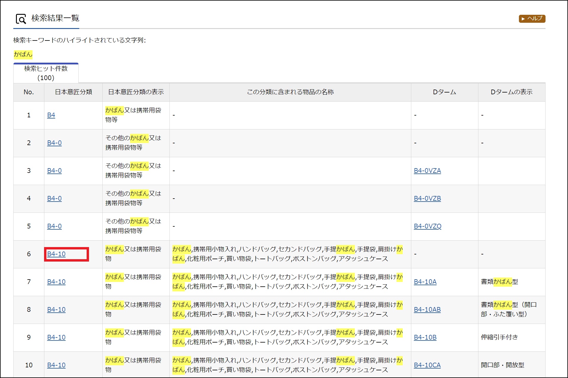 「かばん(かばん又は携帯用袋物)」の日本意匠分類は「B4-10」であることが確認できます。