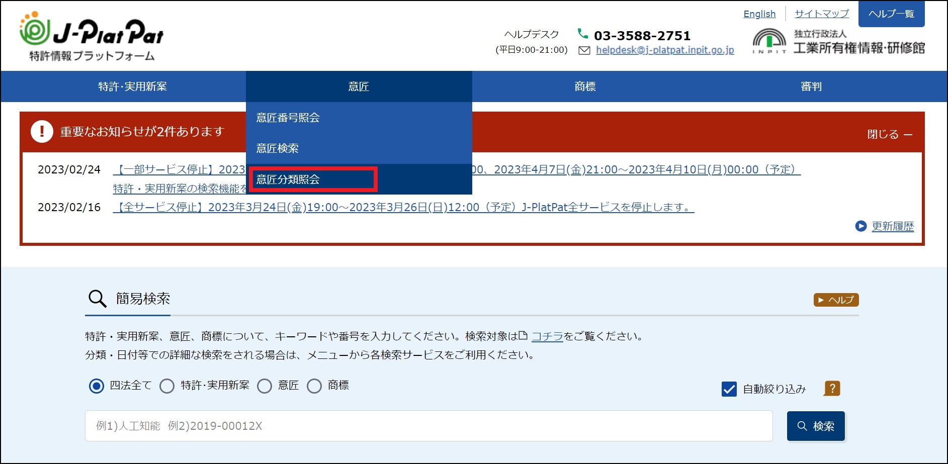(1)グローバルナビゲーションから「意匠」―「意匠分類照会」を選択します。
