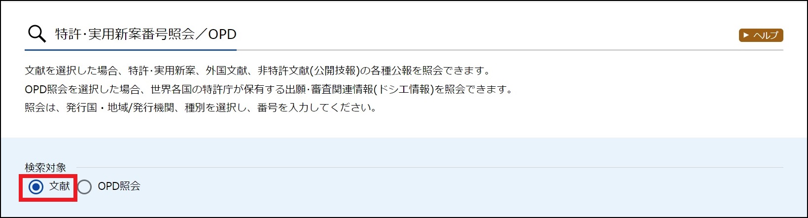 ⇒「特許・実用新案番号照会/OPD」画面が表示されます。