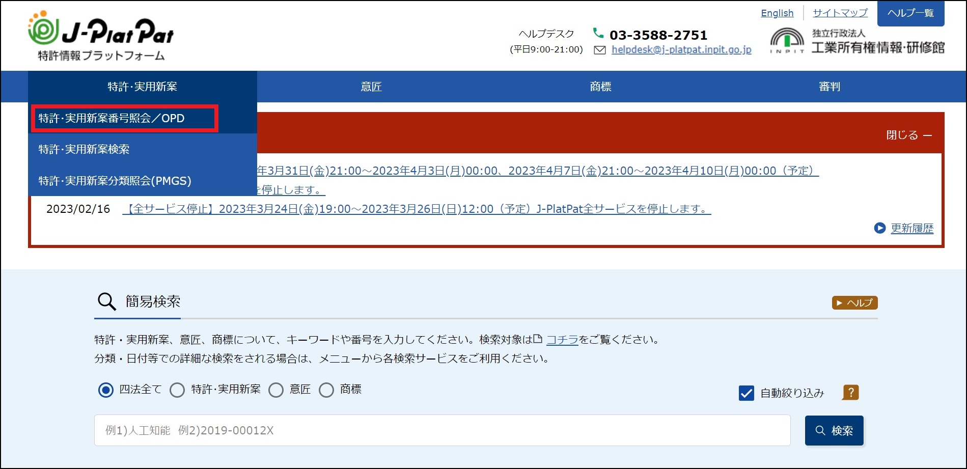 (1)グローバルナビゲーションから「特許・実用新案」―「特許・実用新案番号照会/OPD」を選択します。