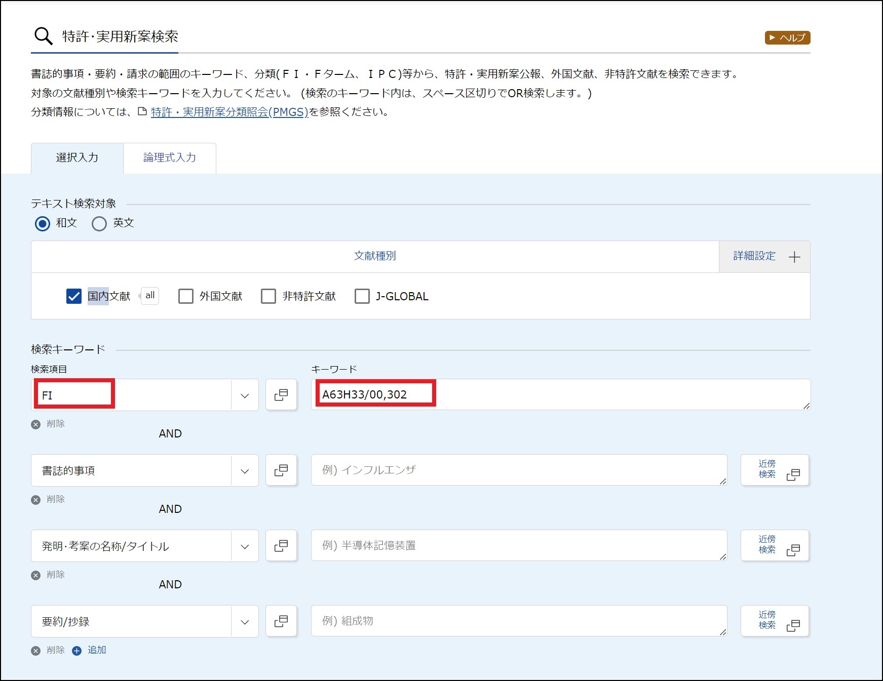 「FI」とその他のキーワード(全文、特許請求の範囲、出願人等)と組み合わせて検索することもできます。