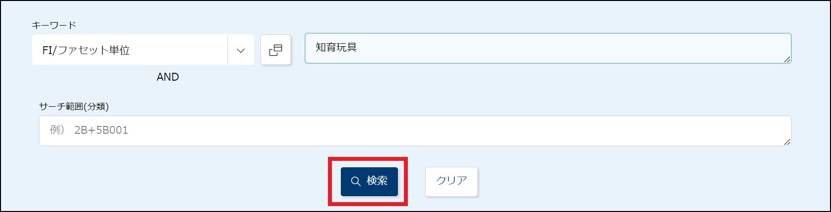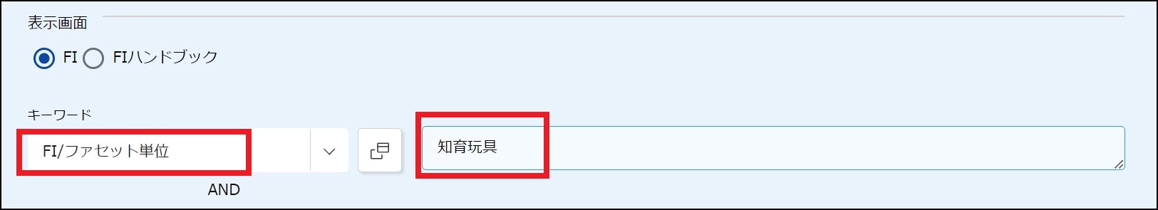 ●「キーワード」で「FI/ファセット単位」を選択し、右側の入力欄に「知育玩具」を入力します。