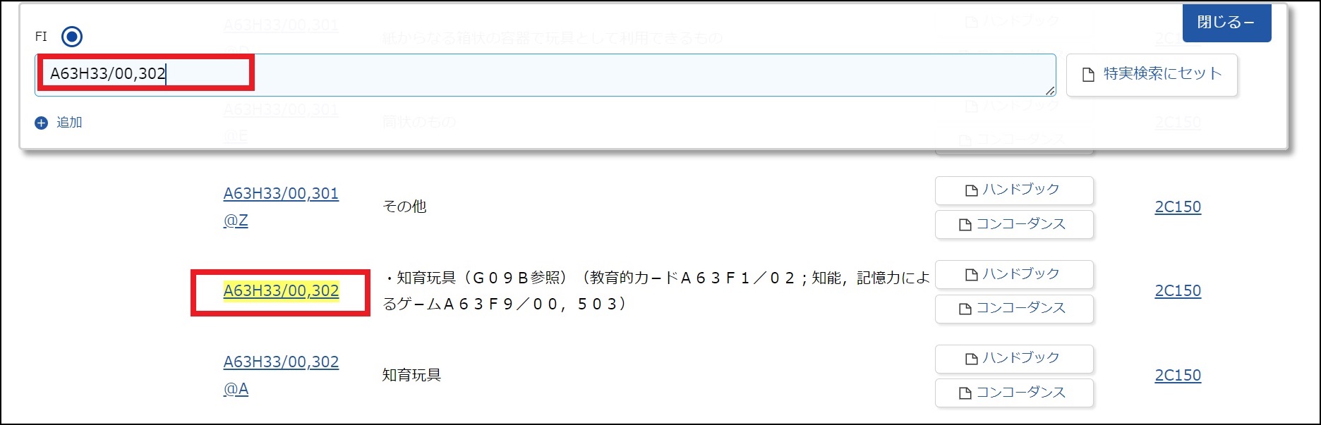 「分類表示」タブのツリーで表示された中から検索をしたい特許分類FI(A63H33/00,302)のリンクを選択します。