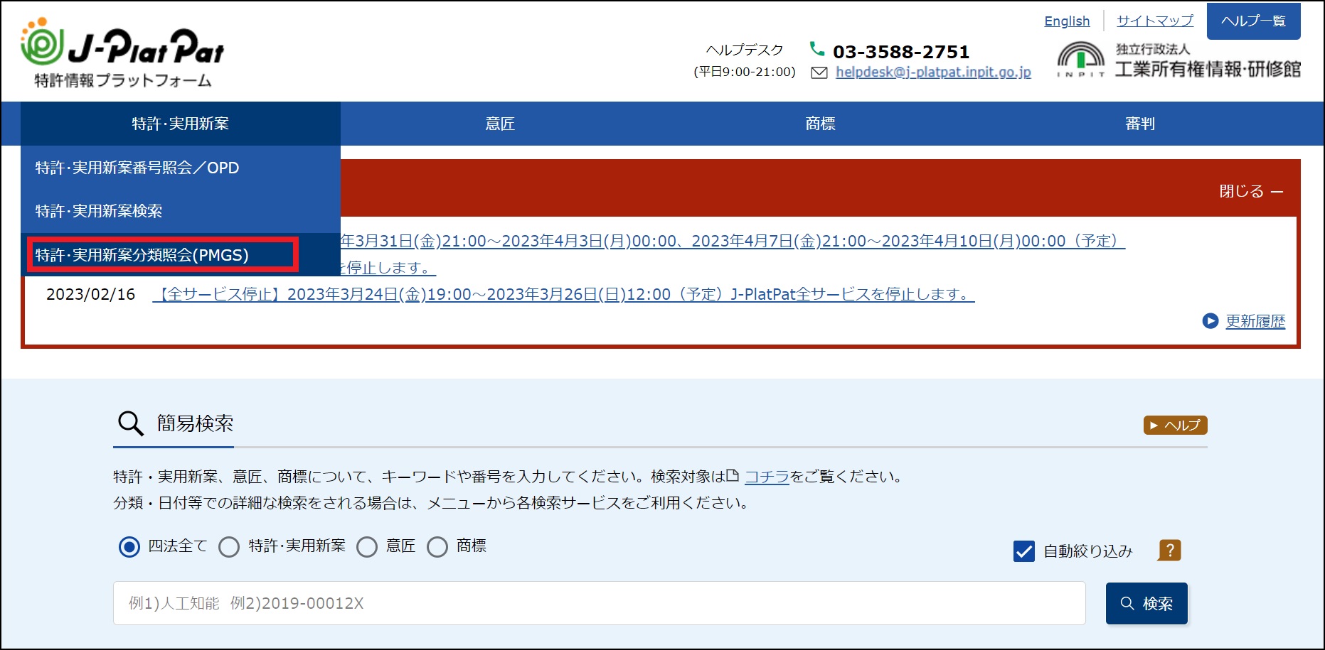 (1)グローバルナビゲーションから「特許・実用新案」―「特許・実用新案分類照会(PMGS)」を選択します。