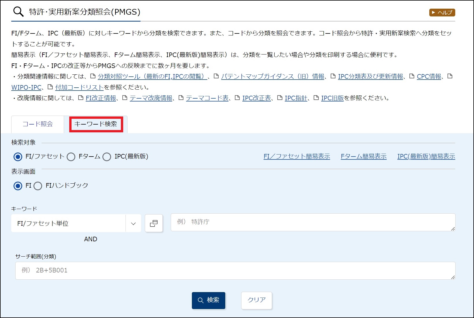 特許分類をキーワードで検索します。
