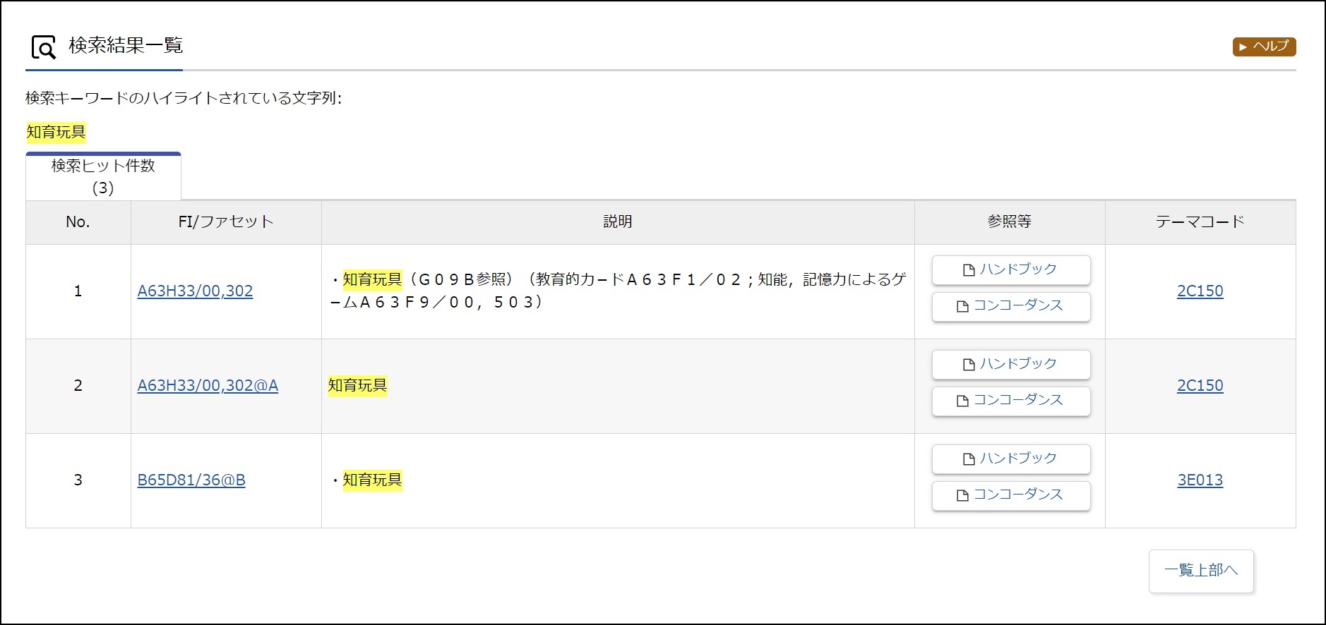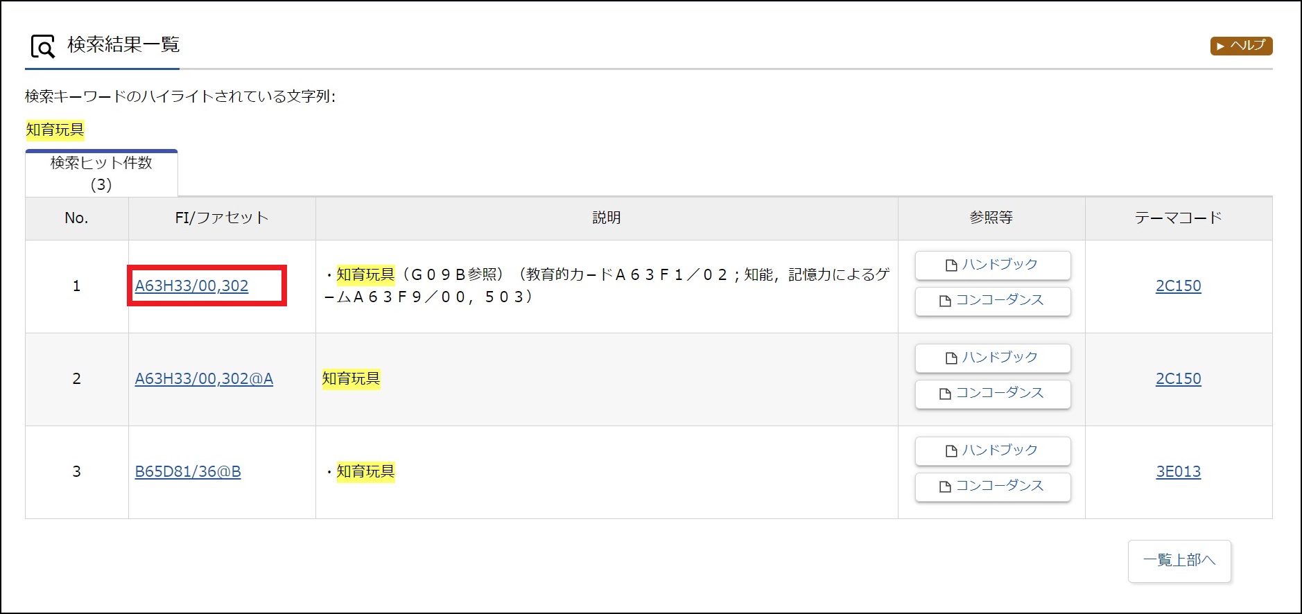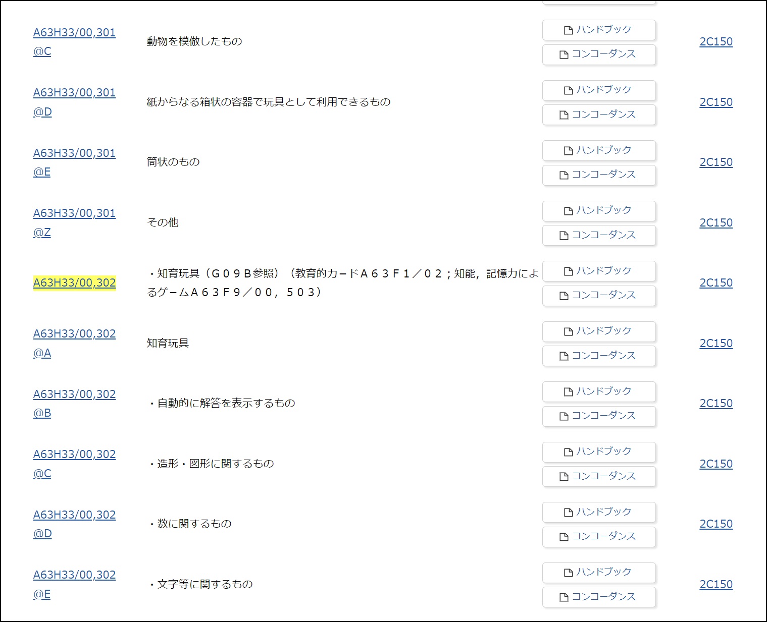 「知育玩具」の特許分類(FI/ファセット)は、「A63H33/00 他の玩具」グループの「A63H33/00,302」であることが確認できます。