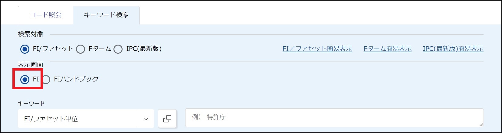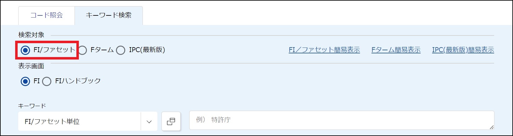 ●「検索対象」で「FI/ファセット」を選択します。