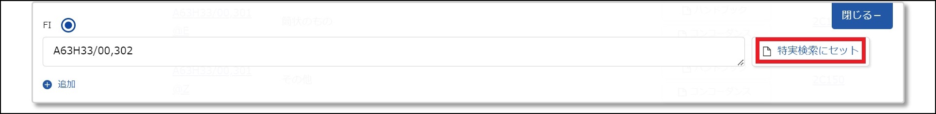 画面の上側に「入力窓」が開き、選択した特許分類(FI)が入力欄に自動で入力されます。