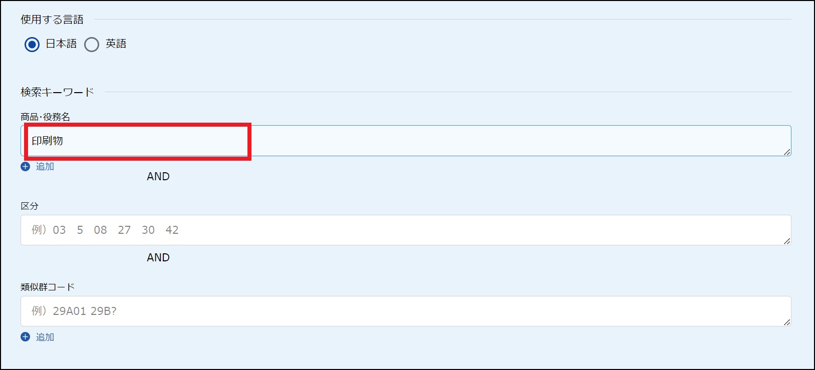 ●「検索キーワード」の「商品・役務名」に「印刷物」と入力します。