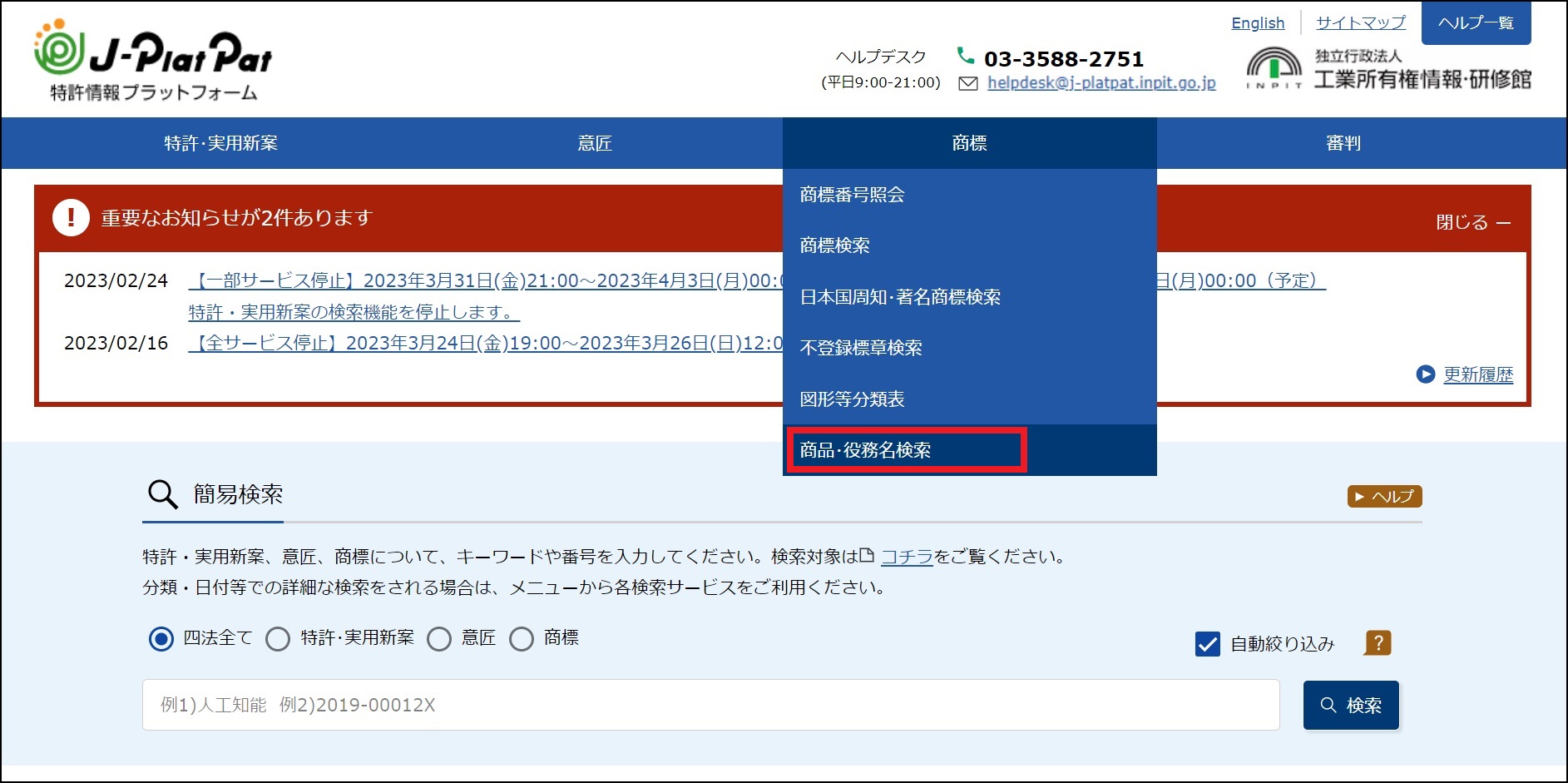 (1)グローバルナビゲーションから「商標」ー「商品・役務名検索」を選択します。