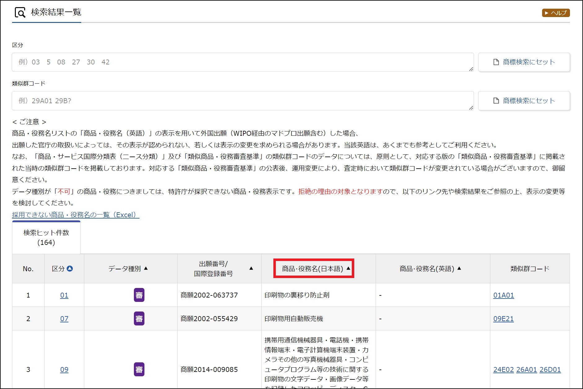 「商品・役務名(日本語)」の列を確認します。