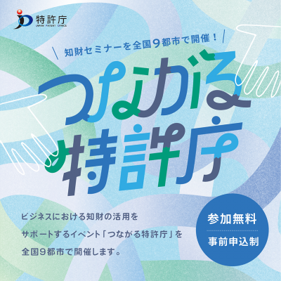 特許庁は、ビジネスにおける知財の活用をサポートするイベント「つながる特許庁」を、今年度は全国9都市に(高知市、盛岡市、札幌市、甲府市、松江市、佐賀市、大阪市、大垣市、宮古島市)拡充して開催します。(参加無料)