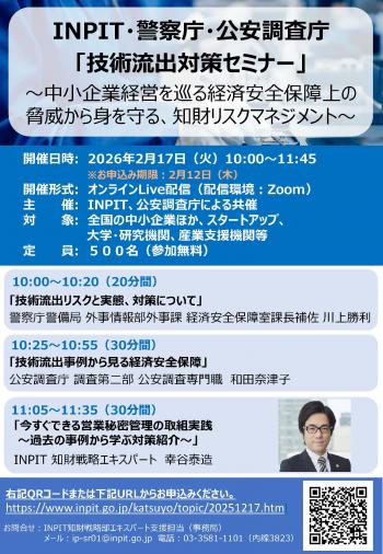本セミナーでは、警察庁及び公安調査庁から、経済安全保障をめぐる国際情勢や懸念主体の最新動向、また実際に国内外で発生した技術流出トラブル事案やその要因等について、ご紹介します。後半部分では、経産省所管の独立行政法人であるINPIT(工業所有権情報・研修館)から、中小企業や大学・研究機関に求められる営業秘密管理の重要性と、取り組むべき具体的な対策について、様々な事例を交えながら分かりやすくご説明します。