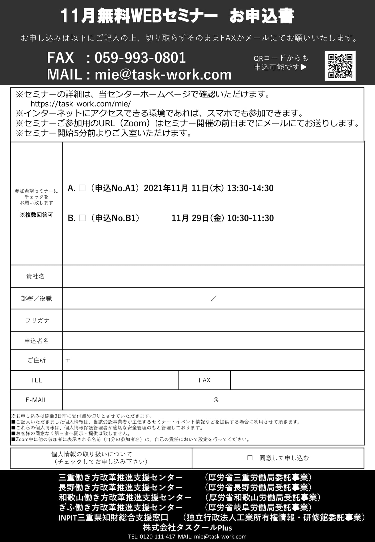 当窓口では、三重働き方改革推進支援センターと連携し、11月も「無料WEBセミナー」を開催しております。