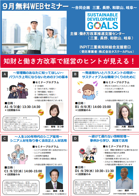 当窓口では、「知財×働き方改革」をテーマに毎月、企業や支援機関の皆さまに役立つセミナーを随時開催しております。