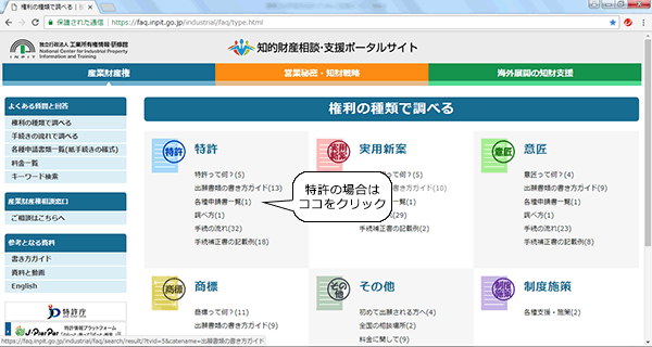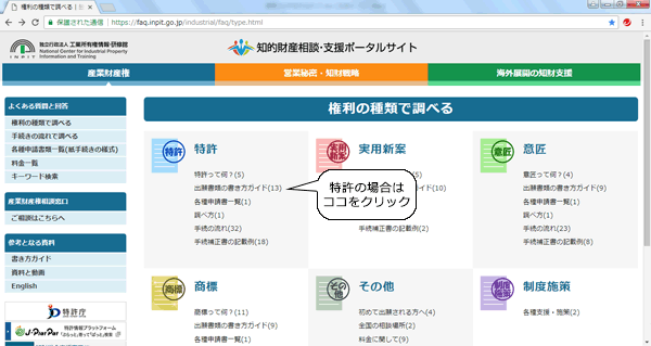 「知的財産相談・支援ポータルサイト」の画面から、『出願書類の書き方ガイド』を選択します。