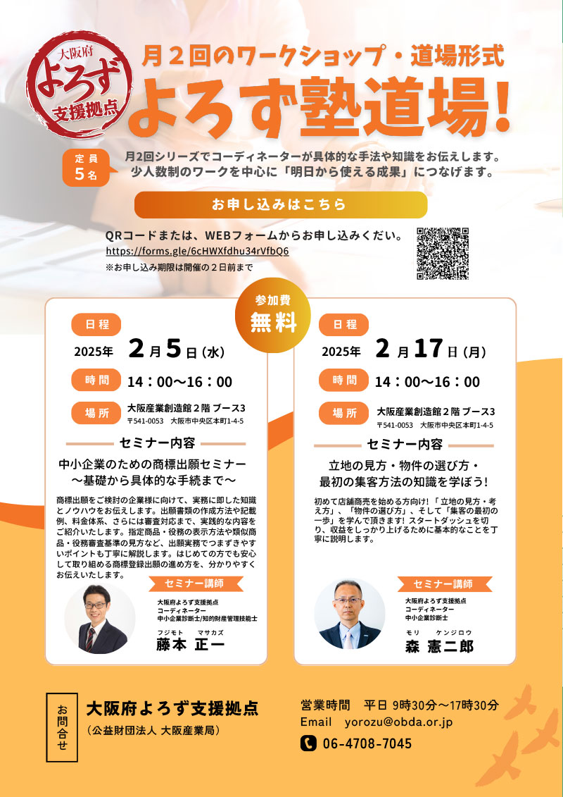【2025年2月5日開催】よろず塾道場!中小企業のための商標出願セミナー~基礎から具体的な手続まで~