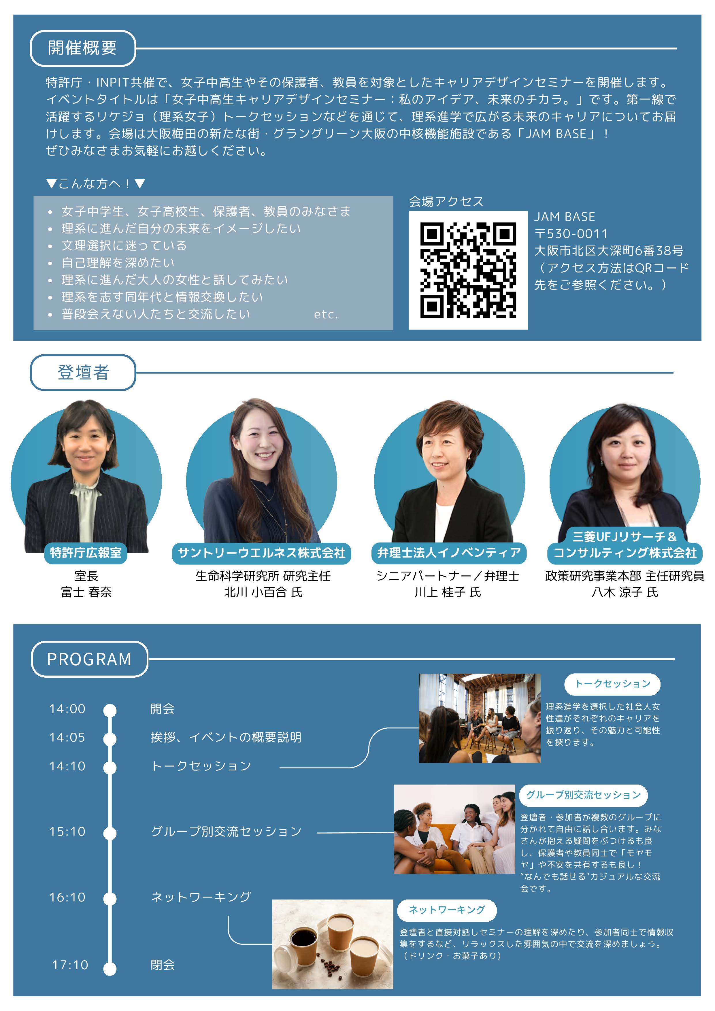 3/26(水)特許庁×INPIT-KANSAI共催「女子中高生キャリアデザインセミナー」開催のお知らせ