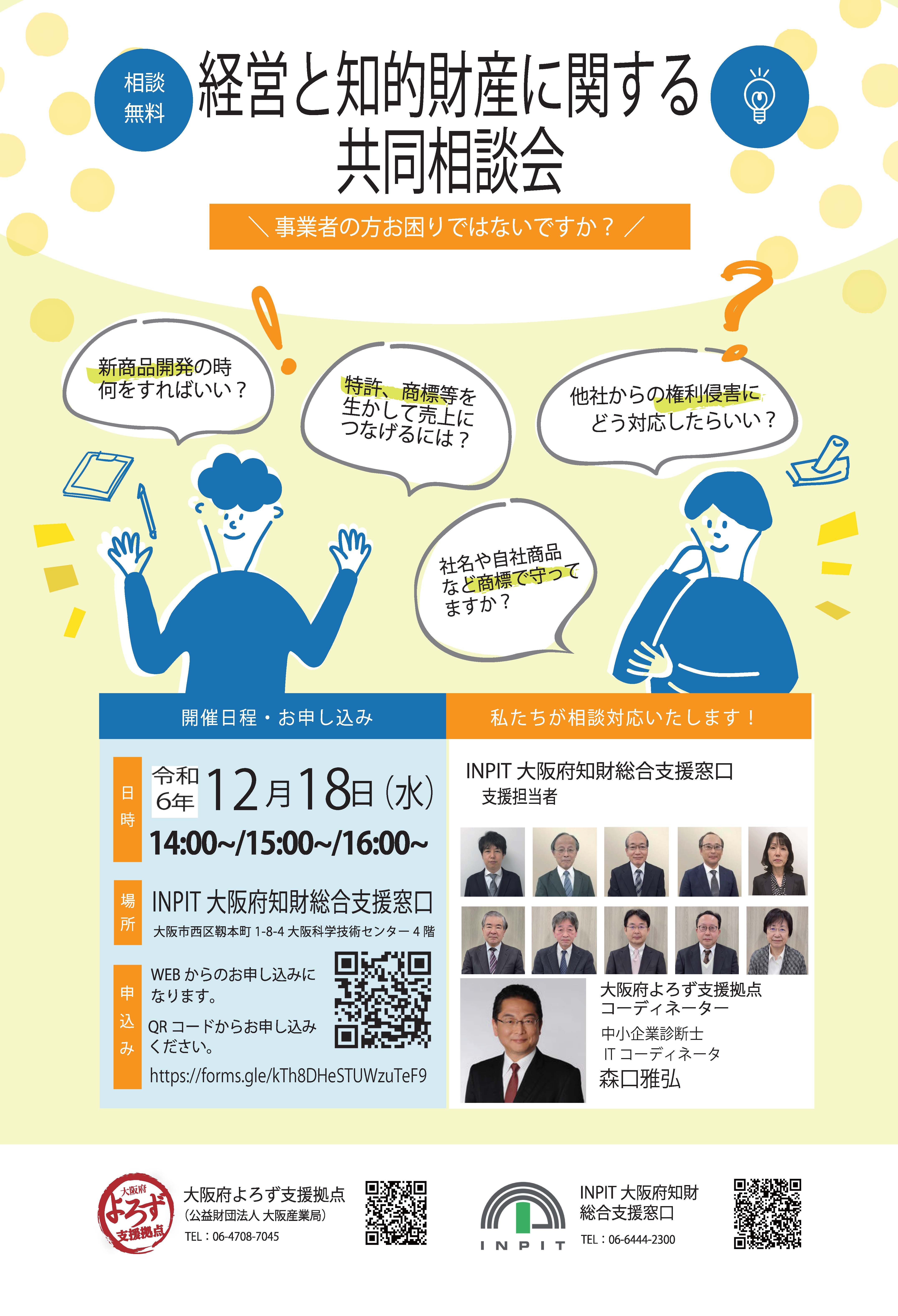 日頃は、INPIT大阪府知財総合支援窓口ならびに大阪府よろず支援拠点のご利用、誠にありがとうございます。令和6年度も両拠点はタッグを組み、中小企業様の経営と知的財産に関する一体型相談会を8月(終了)・10月(終了)・12月・2月の全4回にわたり開催してまいります。今回は、第3回の開催案内でございます。