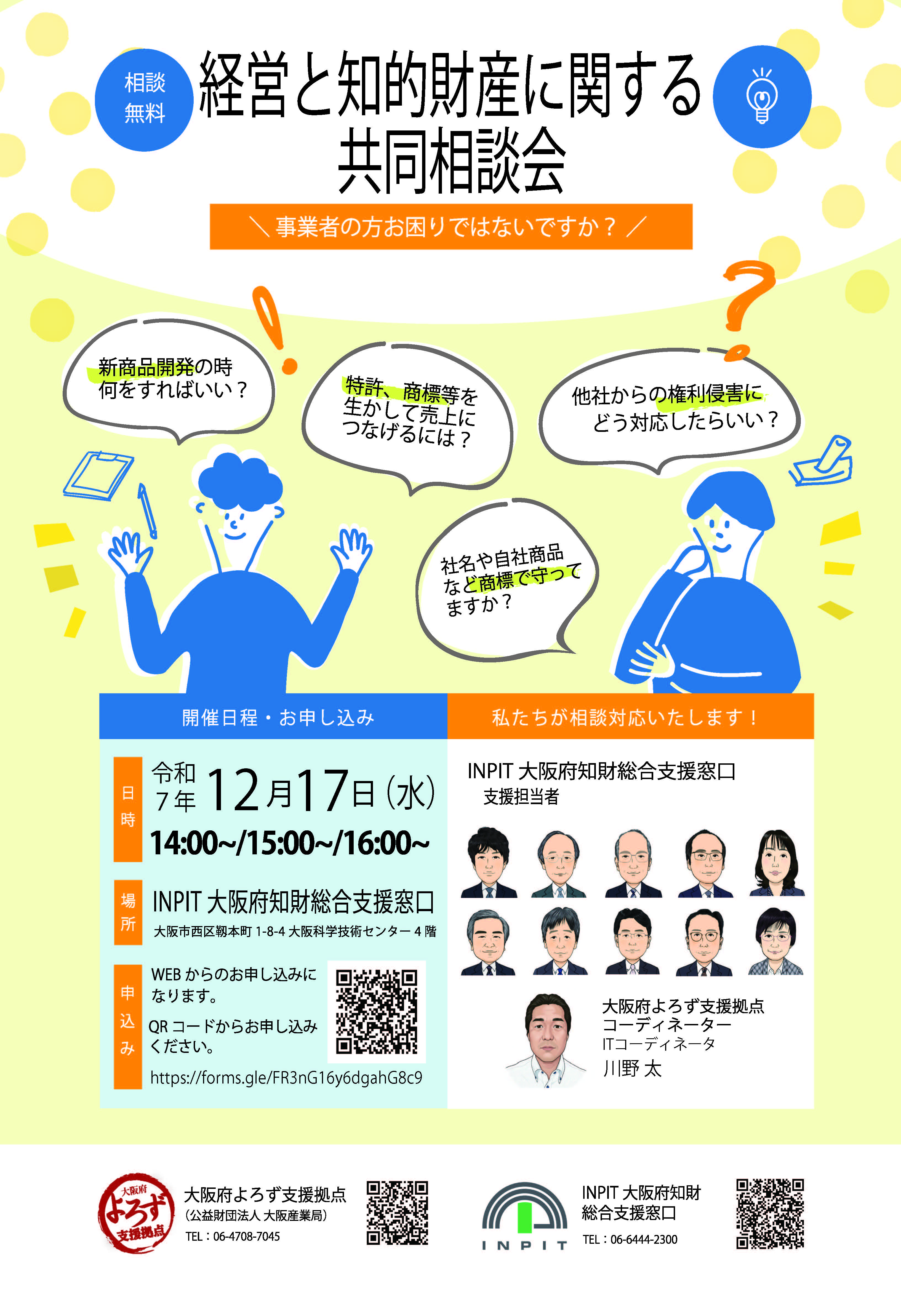 日頃は、INPIT大阪府知財総合支援窓口ならびに大阪府よろず支援拠点のご利用、誠にありがとうございます。令和7年度も両拠点はタッグを組み、中小企業様の経営と知的財産に関する一体型相談会を8月・10月・12月・2月の全4回にわたり開催しております。今回は、第3回の開催案内でございます。