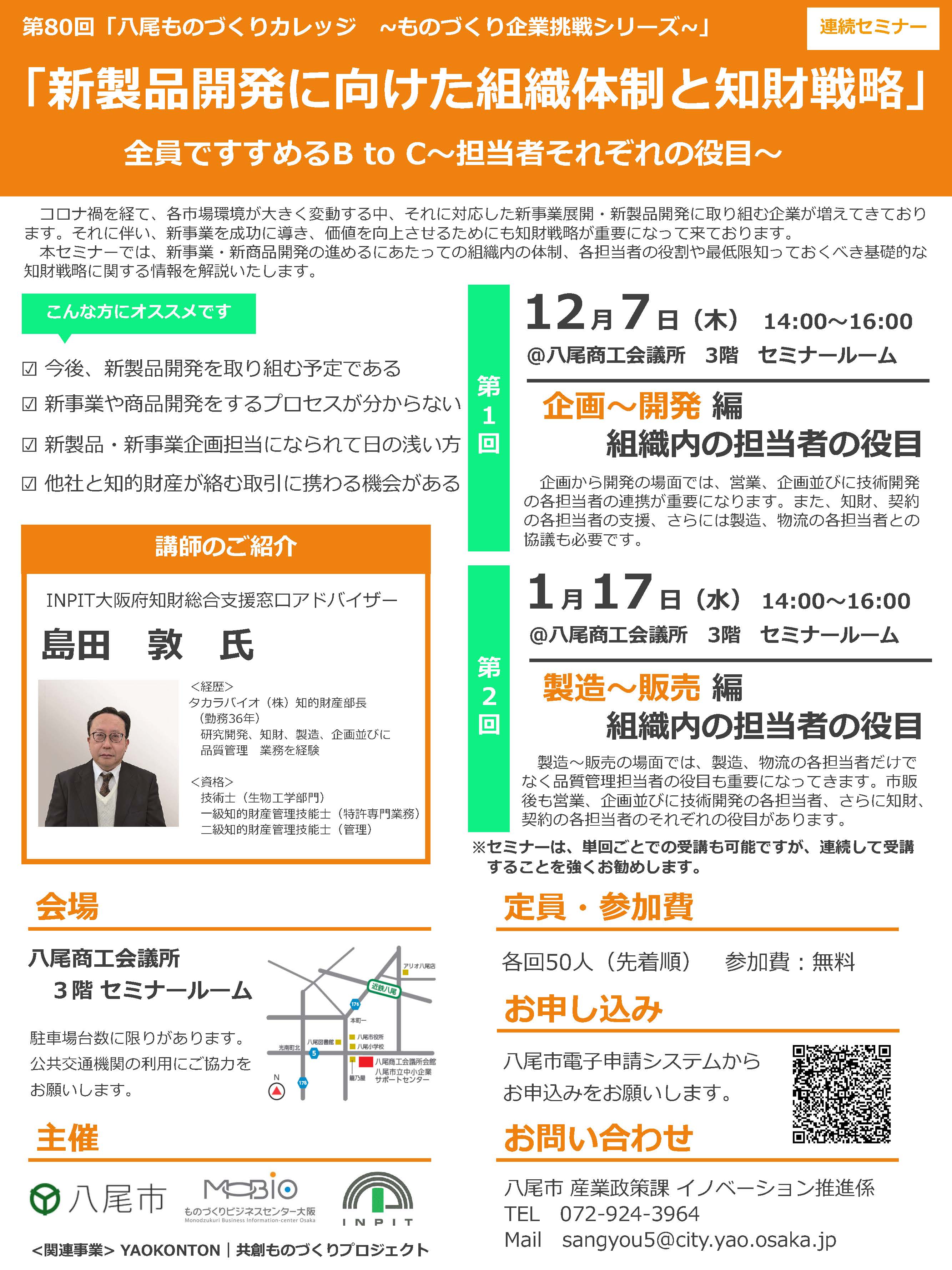 主 催 :八尾市、ものづくりビジネスセンター大阪(MOBIO)、独立行政法人工業所有権情報・研修館(INPIT)
