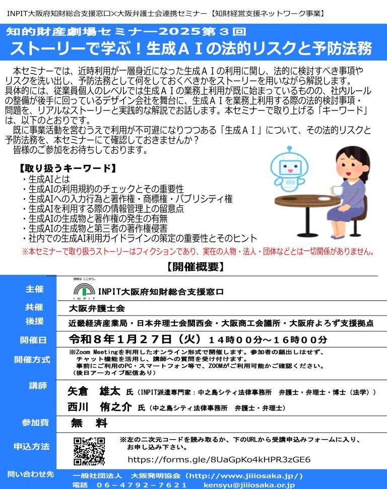 INPIT⼤阪府知財総合⽀援窓⼝✕⼤阪弁護⼠会連携セミナー「知的財産劇場セミナー2025第3回「ストーリーで学ぶ︕⽣成AIの法的リスクと予防法務」開催のご案内