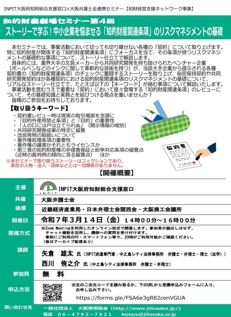 INPIT⼤阪府知財総合⽀援窓⼝✕⼤阪弁護⼠会連携セミナー「知的財産劇場セミナー:ストーリーで学ぶ!中小企業を悩ませる「知的財産関連条項」のリスクマネジメントの基礎」開催のご案内