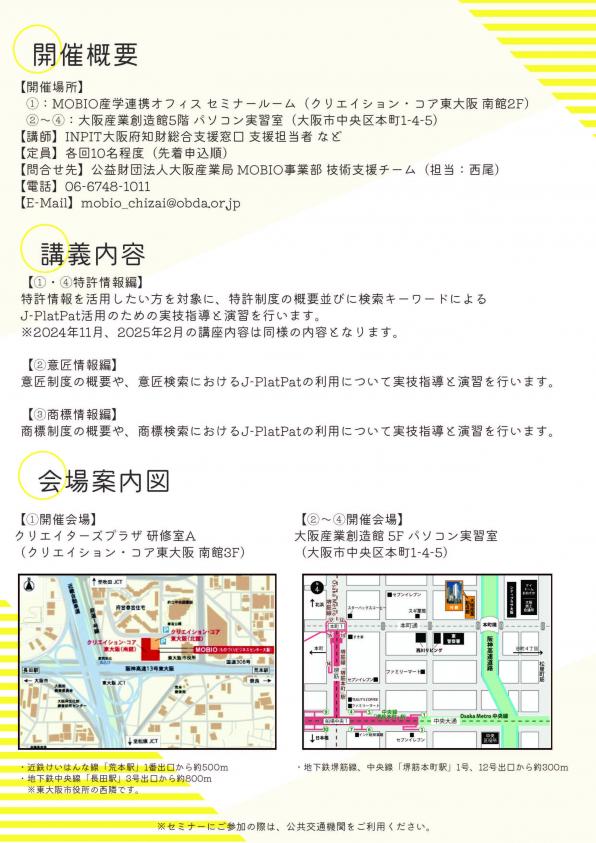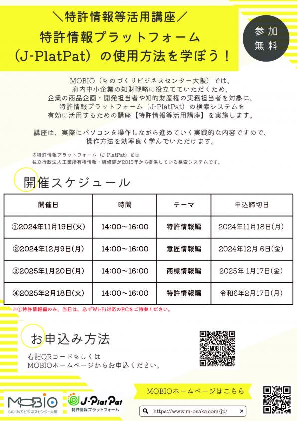 MOBIO(ものづくりビジネスセンター大阪)では、府内中小企業の知財戦略に役立てていただくため、企業の知的財産権の実務を担当されている方を対象に、特許情報プラットフォーム(J-PlatPat)の検索システムを有効に活用するための講座【特許情報等活用講座】を実施します。