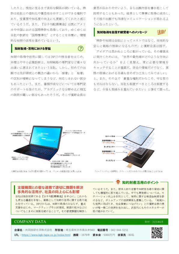 知的財産活用事例集「知恵を『稼ぐ力』に~100社の舞台裏~」に共同技研化学株式会社 様(埼玉県 所沢市)が掲載されました