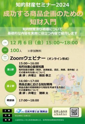 知的財産及び商標について基礎的な内容を実務に役立つ内容で紹介します。2部形式で相談会もセミナー後にございますのでお気軽にお申込み下さい。