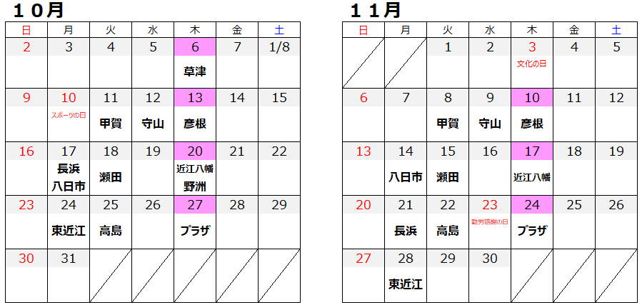 ・ピンク色の日程は、「知財・よろず木曜相談会」で、滋賀県知財総合支援窓口と滋賀県よろず支援拠点とが共同して、相談対応をいたします。