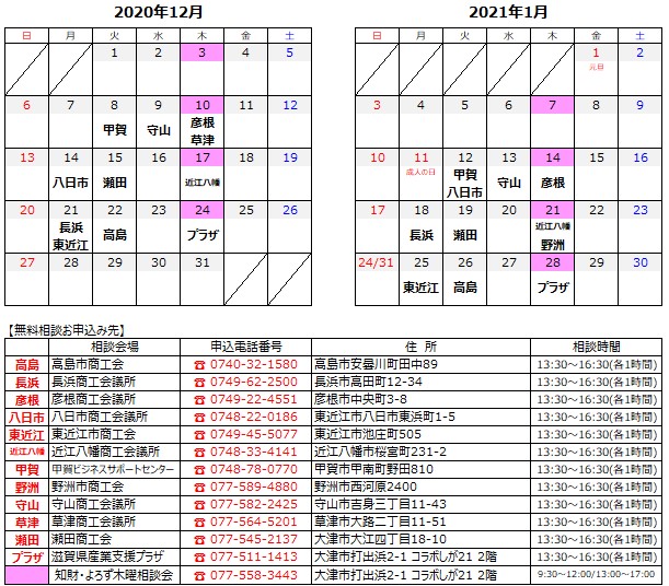 ・ピンク色の日程は、「知財・よろず木曜相談会」で、滋賀県知財総合支援窓口と滋賀県よろず支援拠点とが共同して、相談対応をいたします。