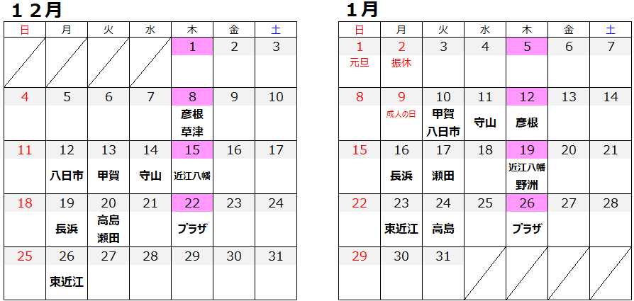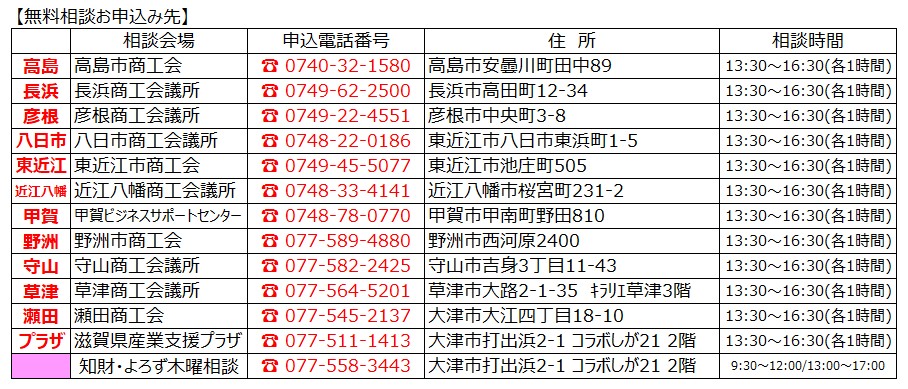 ・ピンク色の日程は、「知財・よろず木曜相談会」で、滋賀県知財総合支援窓口と滋賀県よろず支援拠点とが共同して、相談対応をいたします。