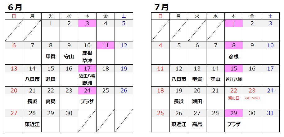 ・ピンク色の日程は、「知財・よろず木曜相談会」で、滋賀県知財総合支援窓口と滋賀県よろず支援拠点とが共同して、相談対応をいたします。