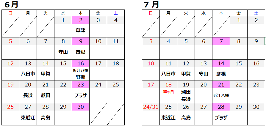 ・ピンク色の日程は、「知財・よろず木曜相談会」で、滋賀県知財総合支援窓口と滋賀県よろず支援拠点とが共同して、相談対応をいたします。