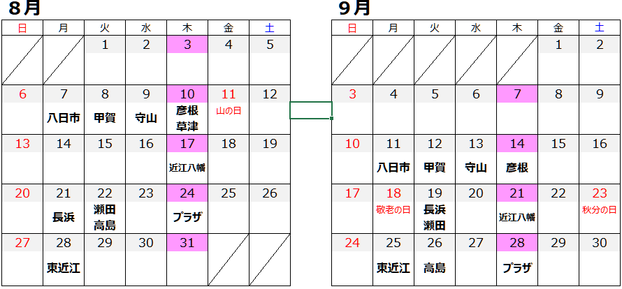 ・ピンク色の日程は「知財・よろず木曜相談会」で、滋賀県知財総合支援窓口と滋賀県よろず支援拠点とが共同で相談対応をいたします。