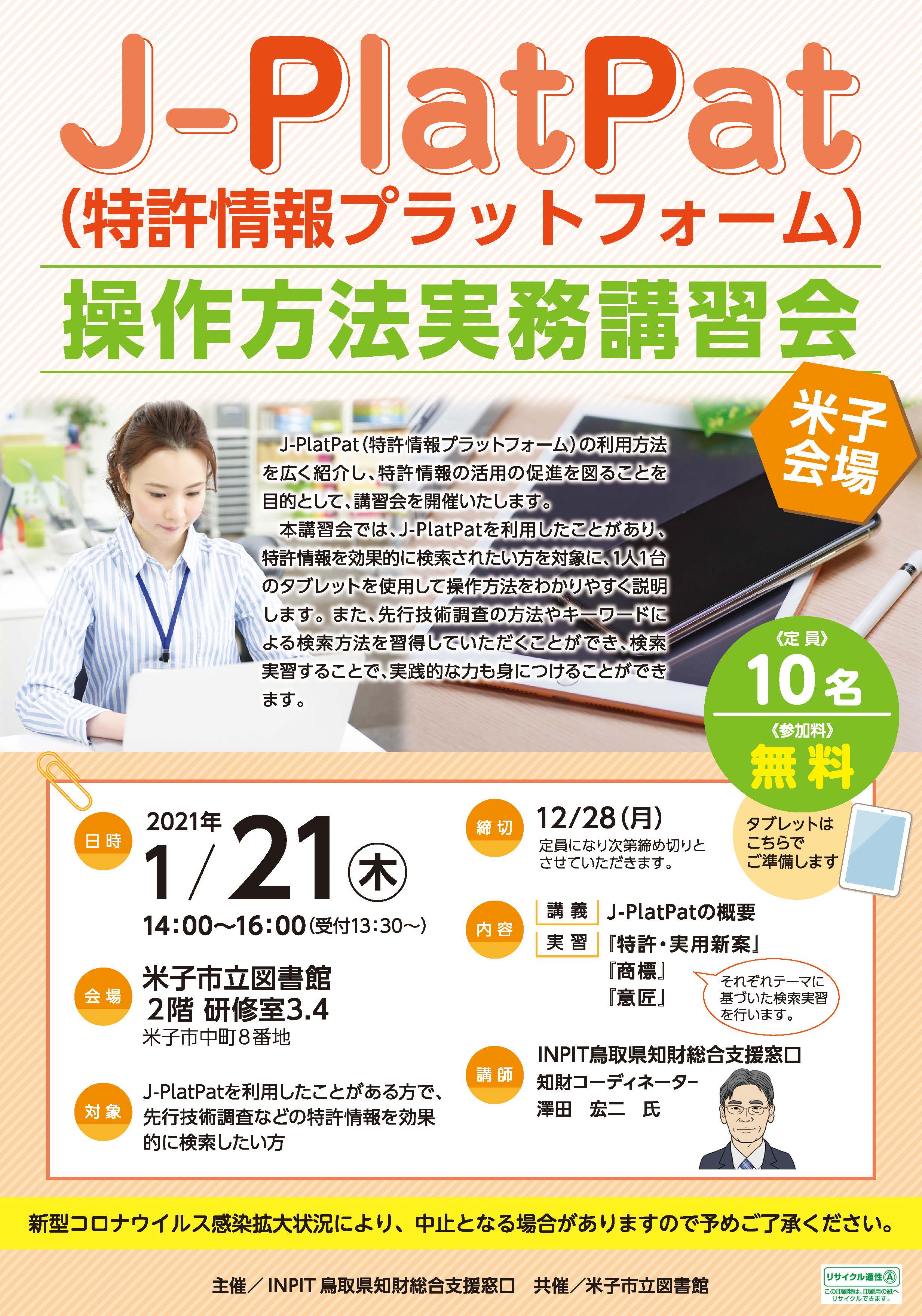 【募集は終了しました】《1/21》J-PlatPat(特許情報プラットフォーム)操作方法実務講習会(米子)開催のお知らせ