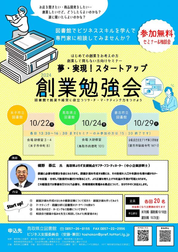 【募集は終了しました】(鳥取県立図書館より)10/22米子市立図書館、10/24鳥取県立図書館、10/29倉吉市立図書館「夢・実現!スタートアップ創業勉強会」開催のお知らせ