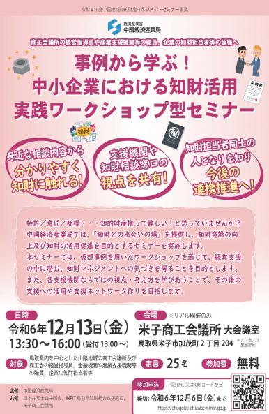 【募集は終了しました】(中国経済産業局より)12/13開催「事例から学ぶ!中小企業における知財活用実践ワークショップ型セミナーin米子商工会議所」のご案内
